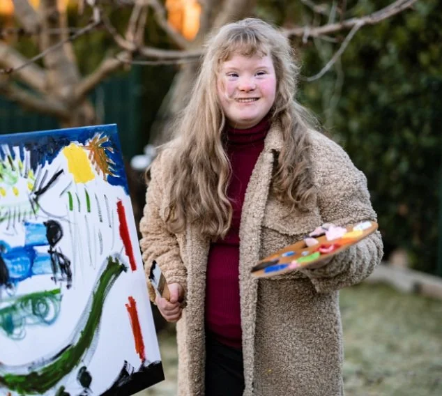 young girl with down syndrome outside painting nature art smiling included and welcome